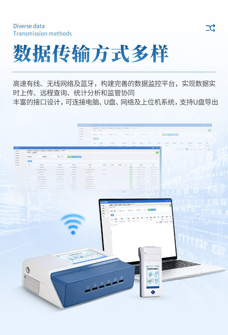 13、支持Wifi網(wǎng)絡(luò),數(shù)據(jù)可局域網(wǎng)和互聯(lián)網(wǎng)數(shù)據(jù)上傳,檢測結(jié)果直接傳至食品安全監(jiān)管平臺。進(jìn)行區(qū)域食品安全監(jiān)管及大數(shù)據(jù)分析處理,檢測區(qū)域食品安全長短期動態(tài),達(dá)到食品安全問題預(yù)估、預(yù)警