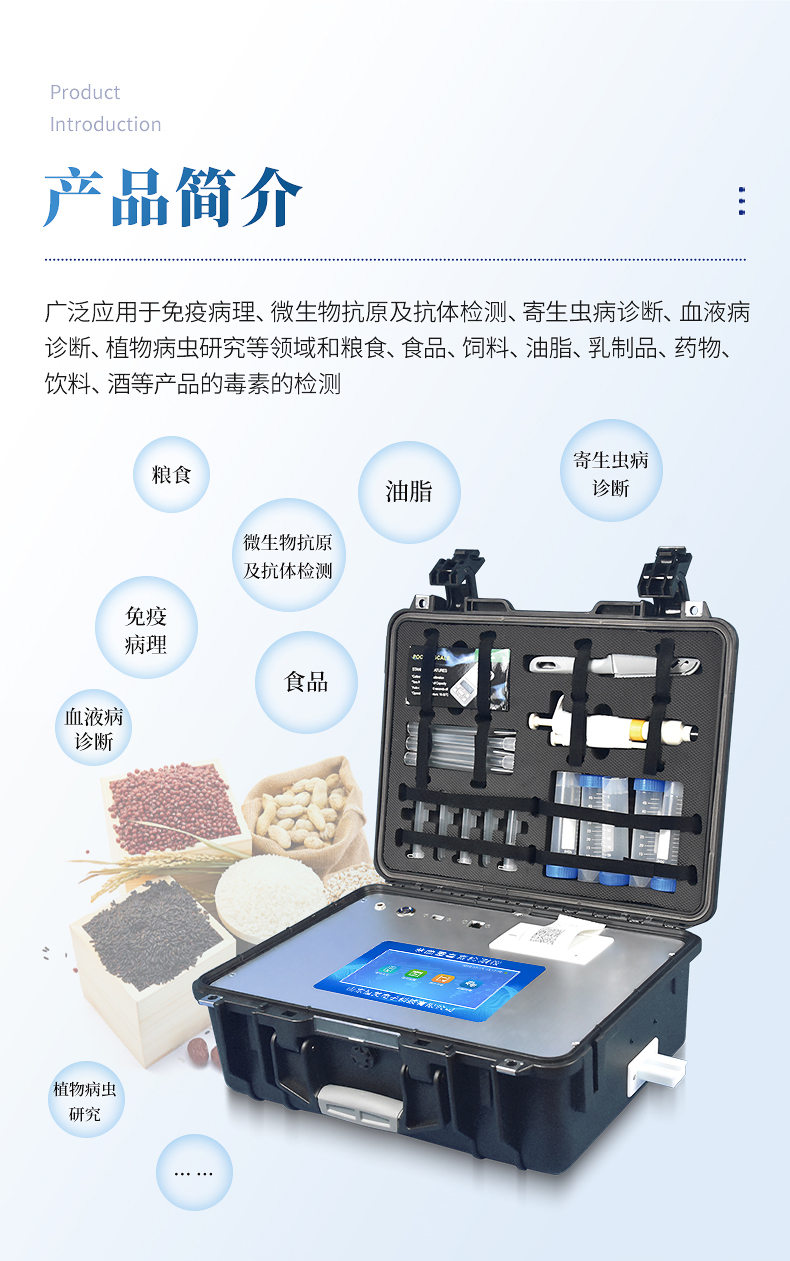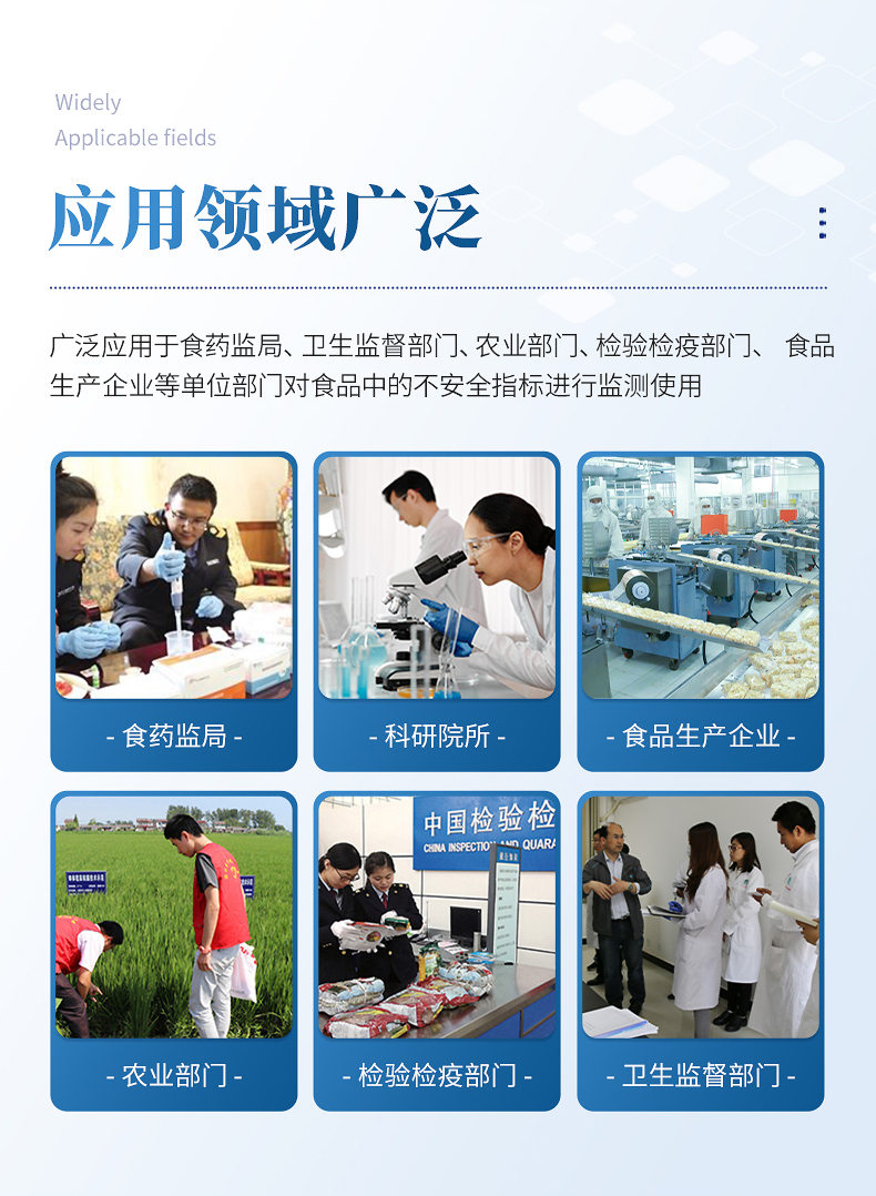該儀器廣泛應用于食藥監局、衛生監督部門(mén)、農業(yè)部門(mén)、檢驗檢疫部門(mén)、食品生產(chǎn)企業(yè)等單位部門(mén)對食品中的不安全指標進(jìn)行監測使用。