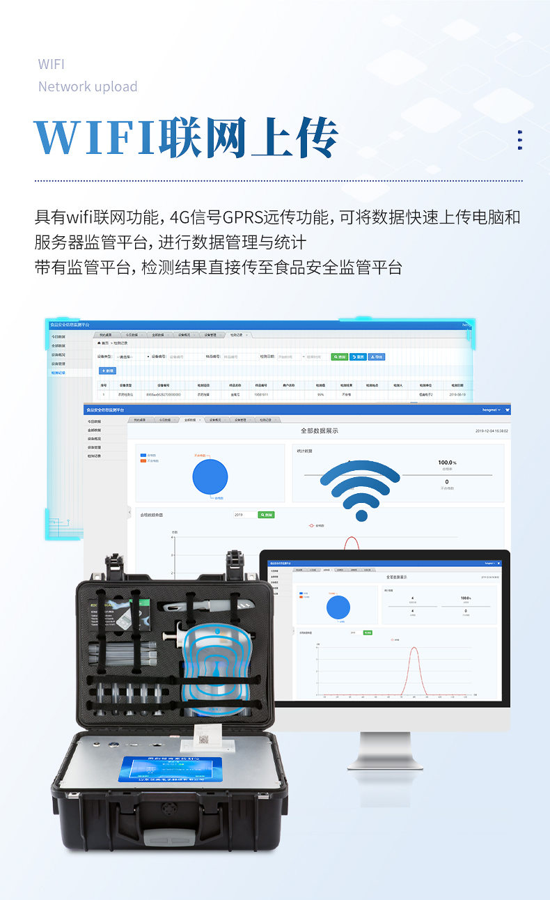 4、儀器帶有監管平臺,數據可局域網(wǎng)和互聯(lián)網(wǎng)數據上傳,檢測結果直接傳至食品安全監管平臺。進(jìn)行區域食品安全監管及大數據分析處理與數據統計,檢測區域食品安全長(cháng)短期動(dòng)態(tài),達到食品安全問(wèn)題預估、預警