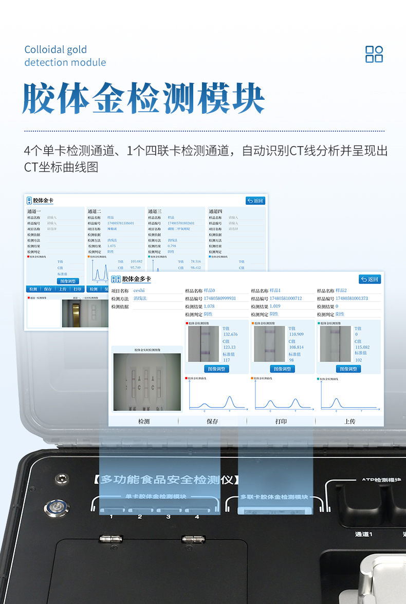 5、★膠體金檢測模塊,4個(gè)單卡檢測通道、1個(gè)四聯(lián)卡檢測通道,自動(dòng)識別CT線(xiàn)分析并呈現出CT坐標曲線(xiàn)圖。