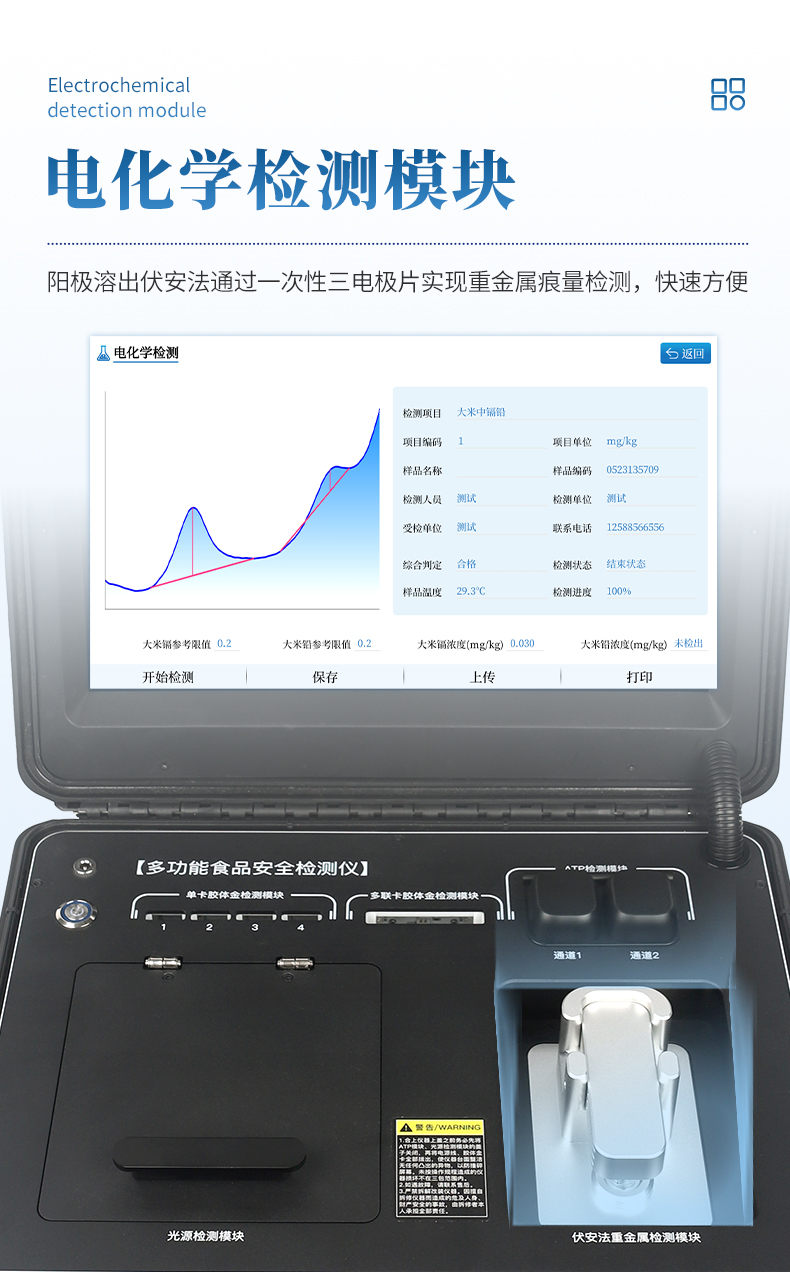 7、★電化學(xué)檢測模塊,陽(yáng)極溶出伏安法通過(guò)一次性三電極片實(shí)現重金屬痕量檢測,快速方便。