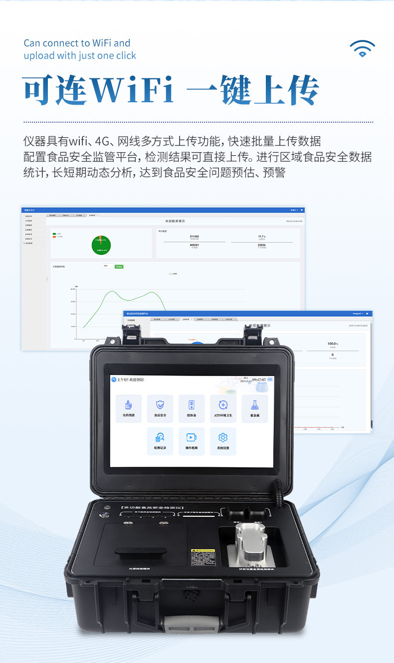 9、標(biāo)配食品安全監(jiān)管平臺(tái),檢測(cè)結(jié)果可直接上傳。進(jìn)行區(qū)域食品安全數(shù)據(jù)統(tǒng)計(jì),長(zhǎng)短期動(dòng)態(tài)分析,達(dá)到食品安全問(wèn)題預(yù)估、預(yù)警。