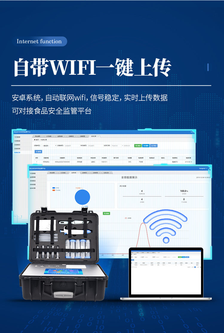 4、儀器帶有監管平臺,數據可局域網(wǎng)和互聯(lián)網(wǎng)數據上傳,檢測結果直接傳至食品安全監管平臺。進(jìn)行區域食品安全監管及大數據分析處理與數據統計,檢測區域食品安全長(cháng)短期動(dòng)態(tài),達到食品安全問(wèn)題預估、預警