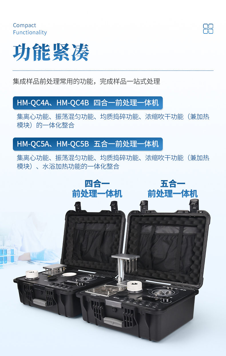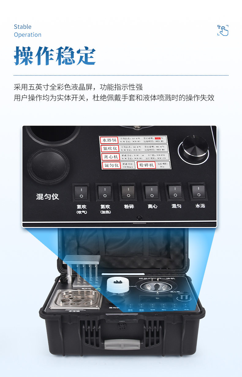 QC4型四合一樣品檢測前處理一體機(箱)是集吹干、離心、均質(zhì)、混勻功能的一體化整合,極大的簡化和集中樣品前處理的一般操作過程,結合移動便攜的工程塑料箱體,特別適合農(nóng)獸藥殘留畜禽水產(chǎn)品質(zhì)量安全現(xiàn)場快速檢測。